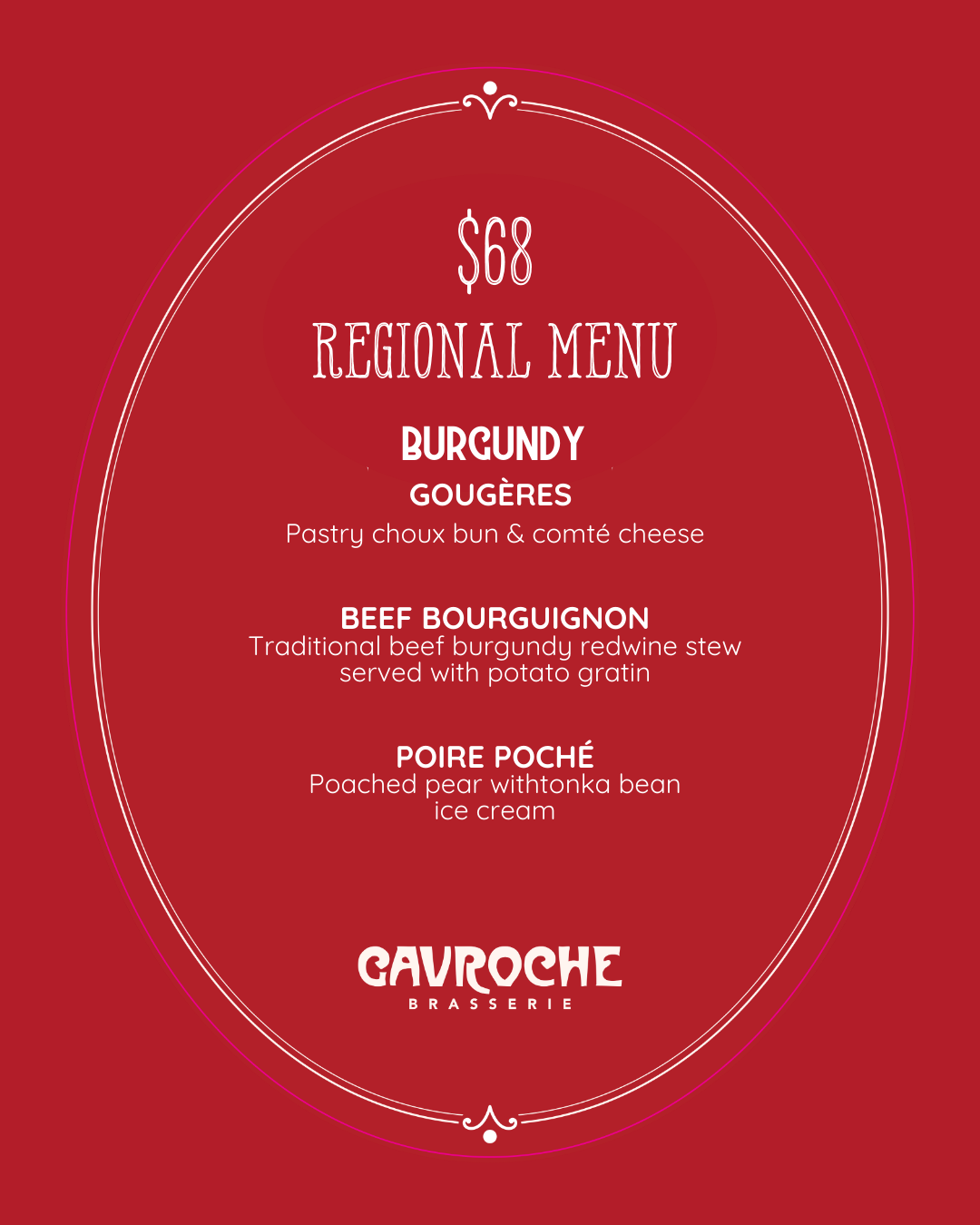 For $68 per person, enjoy a specially curated menu inspired by the region’s classic flavours, designed to pair beautifully with our Burgundy wine specials.