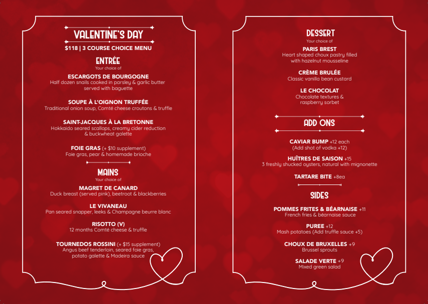 A La Carte available in addition to menu on 13th & 15th. Valentines Day Menu only on the 14th